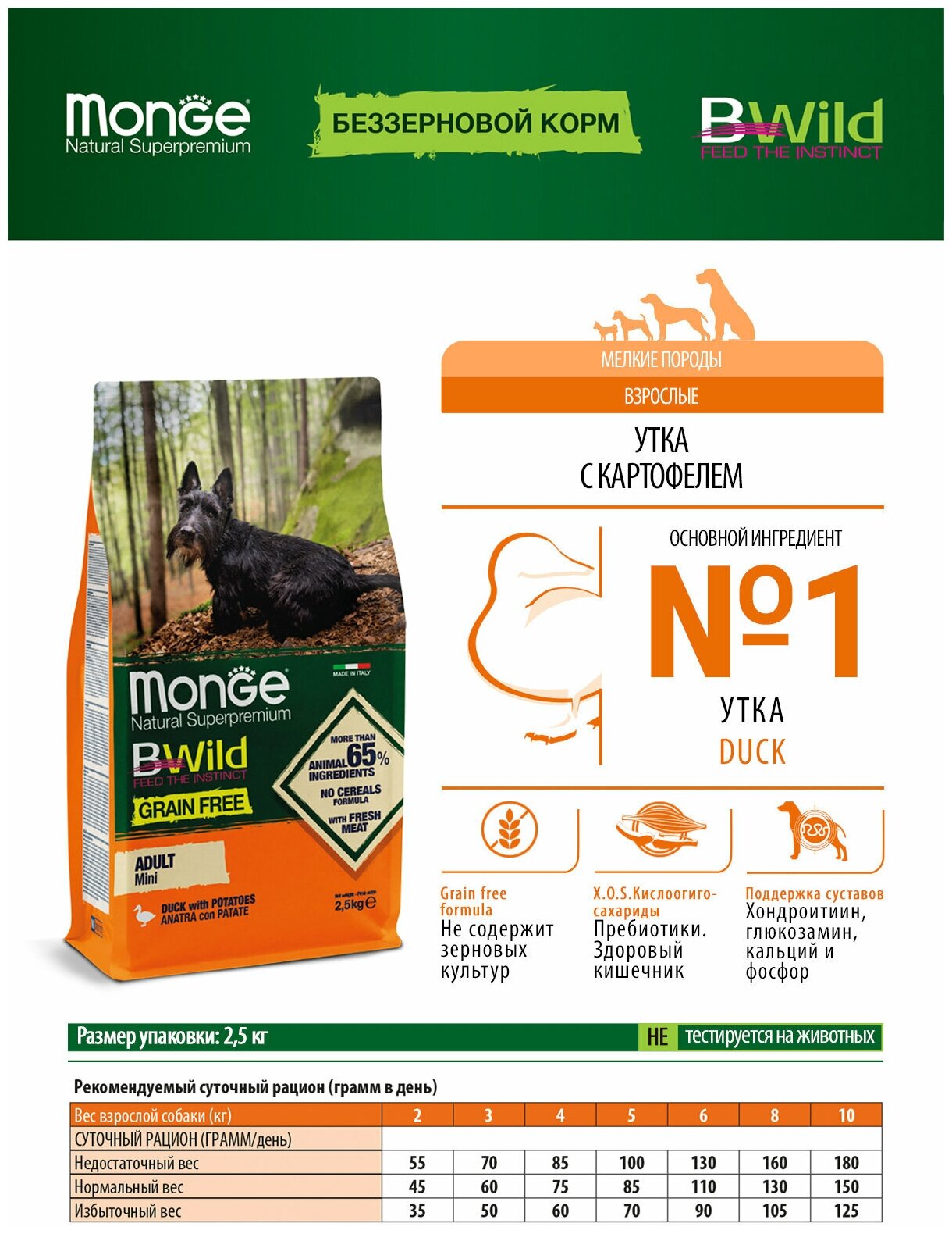 Лучшие цены. Monge (Монж) Dog BWild GRAIN FREE (холистик) Mini беззерновой сухой корм из мяса утки с картофелем для взрослых собак мелких пород 2,5 кг. Появление линии кормов BWild GRAIN FREE было обусловлено идеей создания для собак рациона питания, аналогичного тому, которое получали их неодомашненные предки, получавшие высокобелковую пищу и не употреблявшие зерновые продукты. Рацион подходит питомцам склонным к аллергической реакции на глютен, а также для молодых животных, ведущих активный образ жизни. Магазины в вашем городе.