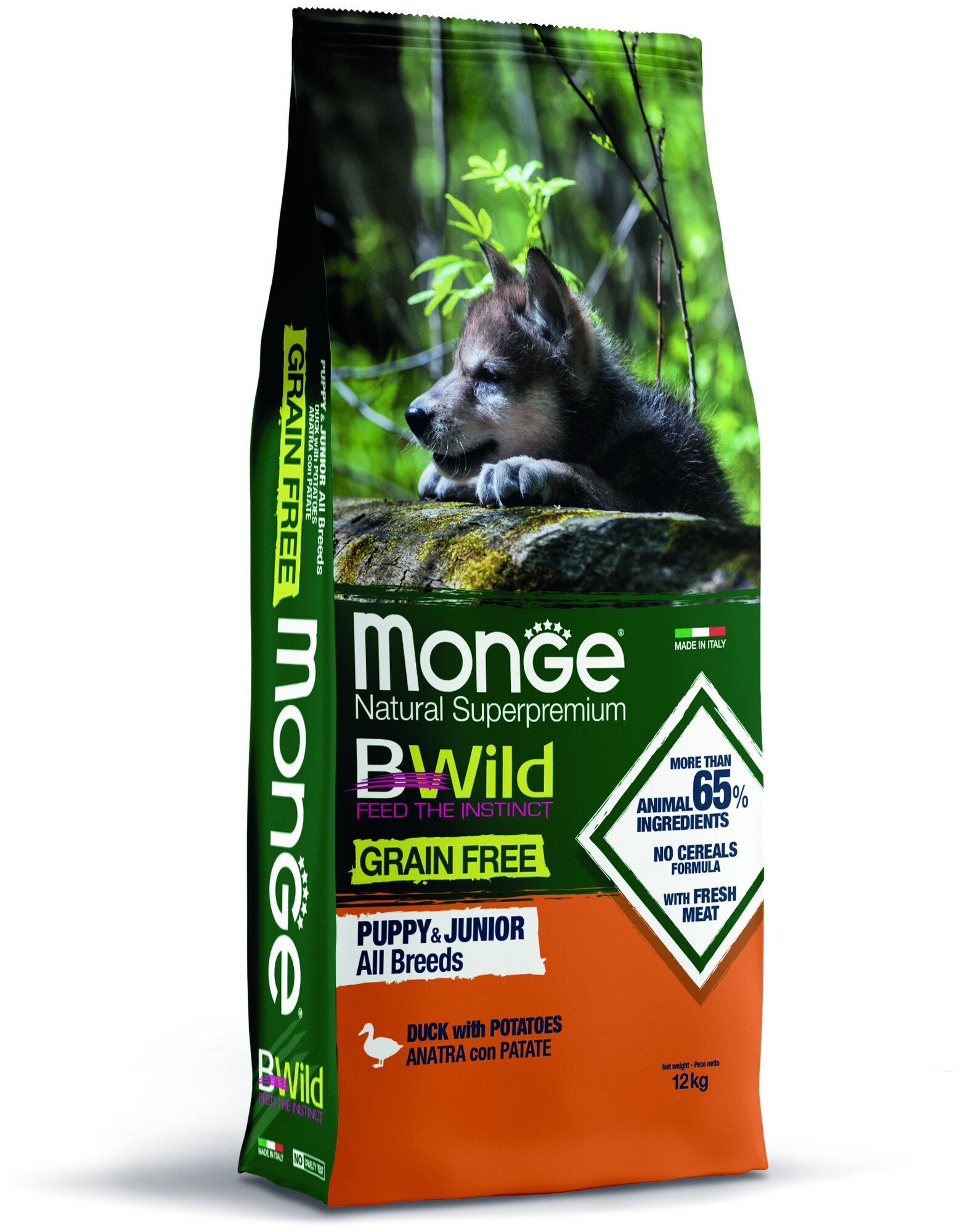 Лучшие цены. Monge (Монж) Dog BWild GRAIN FREE Puppy & Junior (холистик) беззерновой сухой корм из мяса утки с картофелем для щенков всех пород в возрасте от 1 до 12 месяцев 12 кг. Появление линии кормов BWild GRAIN FREE было обусловлено идеей создания для собак рациона питания, аналогичного тому, которое получали их неодомашненные предки, получавшие высокобелковую пищу и не употреблявшие зерновые продукты. Рацион подходит питомцам склонным к аллергической реакции на глютен, а так Monge (Монж). Магазины в вашем городе.