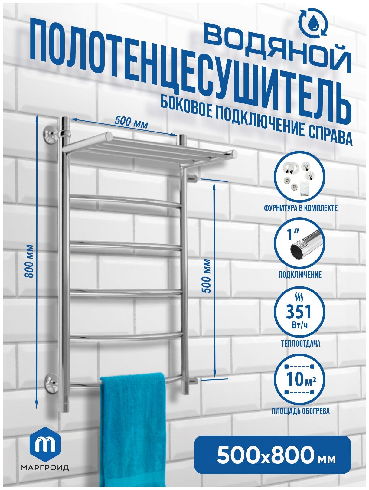 Лучшие цены. Водяной полотенцесушитель Маргроид В4 с полкой 800х500 боковое подключение 50 см цвет хром, тип лесенка сделан из надежной и долговечной пищевой нержавеющей стали марки AISI 304 L и имеет 5 перекладин + 1 верхнюю полку. Изготавливаются они из труб (нержавеющая сталь), наружный диаметр которых составляет 32 мм и 18 мм, толщина стенок - 2 мм. Сварные швы труб сделаны методом аргонной сварки TIG, который соответствует международному стандарту EN 10217-7, и поэтому, едва различимы. Магазины в вашем городе.