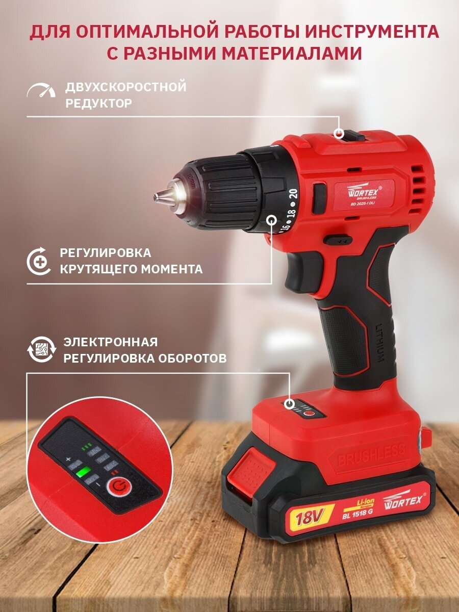 Аккум. дрель-шуруповерт WORTEX BD 2025-1 DLi в чем. (18.0 В, бесщёточный, 2 акк., 1.5 А/ч Li-Ion, 2 скор., 50 Нм, шурупы до 9 мм) (BD20251DLi1029)