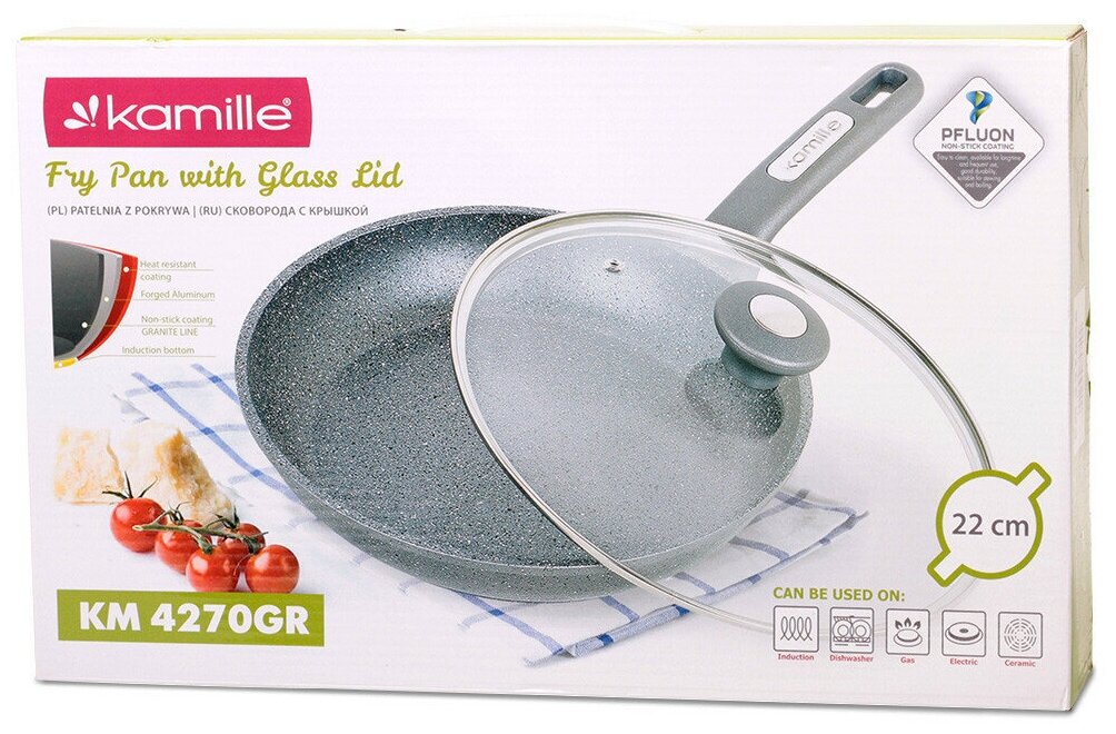 Сковородка Сковорода 22 см. из алюминия с крышкой Kamille KM-4270GR с мраморным покрытием (6)
