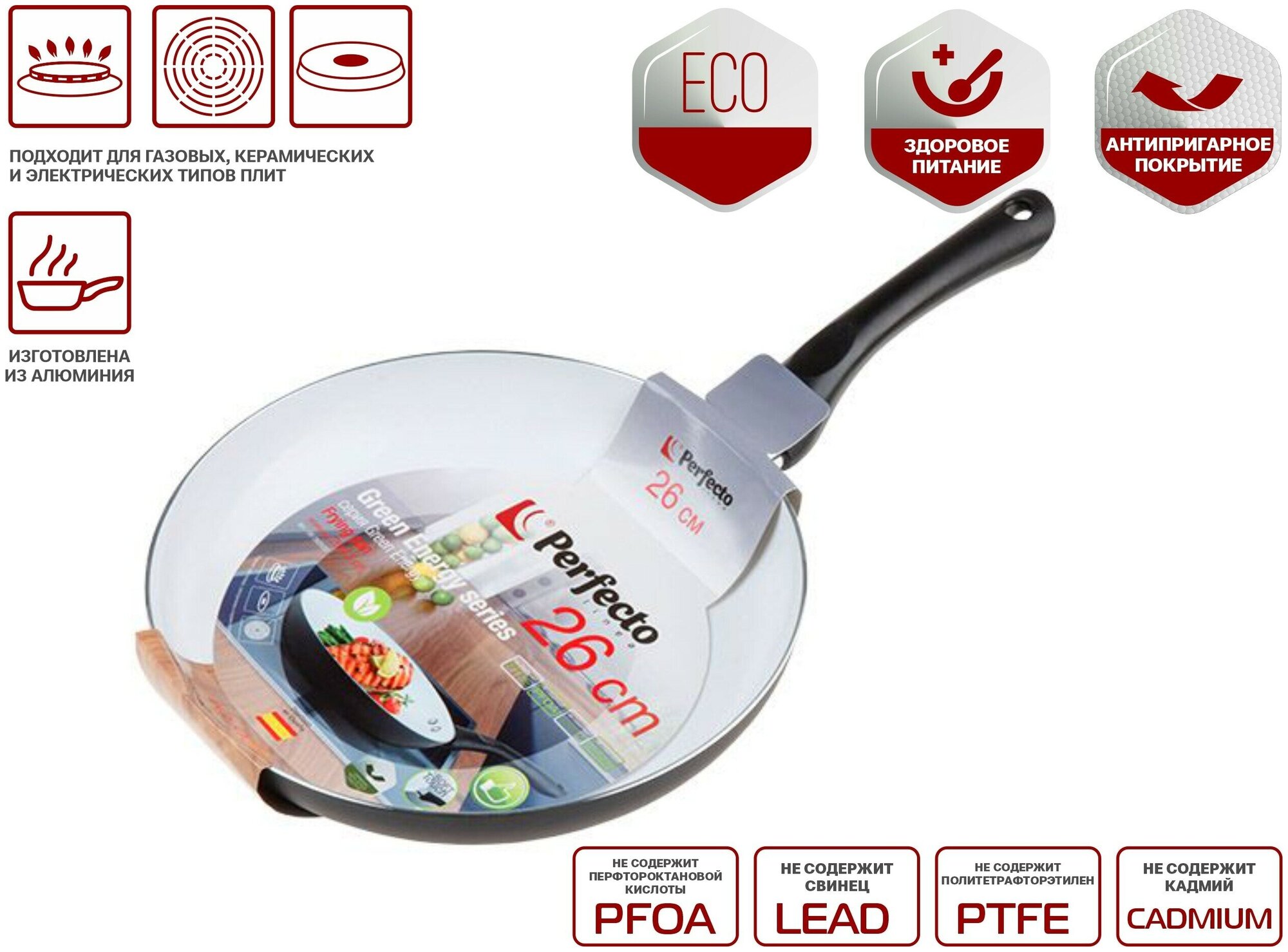 Лучшие цены. Изготовлена из алюминия с натуральным керамическим антипригарным покрытием, без использования перфтороктановой кислоты (PFOA). Мягкая и удобная ручка из теплоизоляционного материала, не нагревается - не нужно использовать полотенца и прихватки. Не выделяет токсичных испарений даже при температуре более 260° C. Не содержит свинец (LEAD), кадмий (CADMIUM), перфтороктановую кислоту (PFOA), политетрафторэтилен (PTFE) Не загрязняет окружающую среду. Подходит для газовых, керамических и электрических типов плит. Магазины в вашем городе.