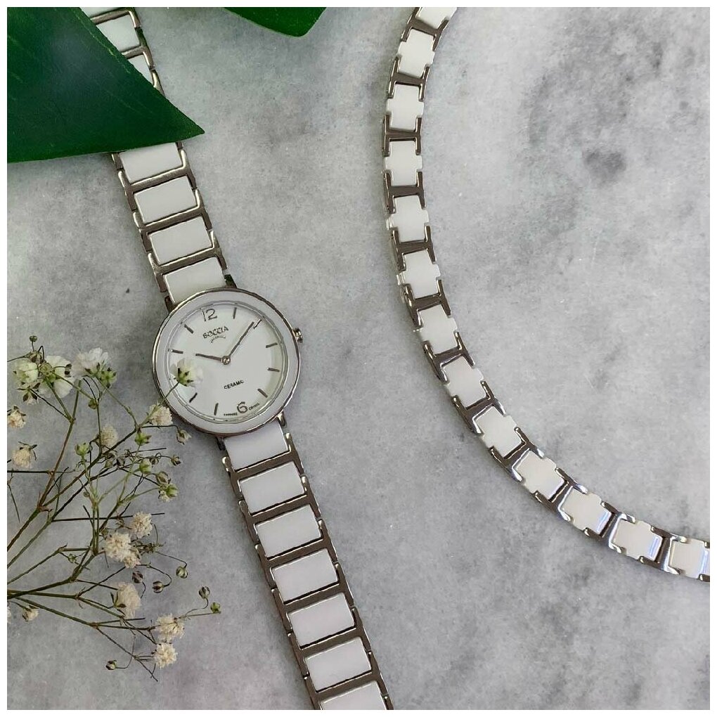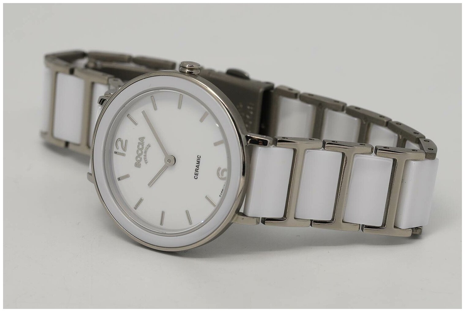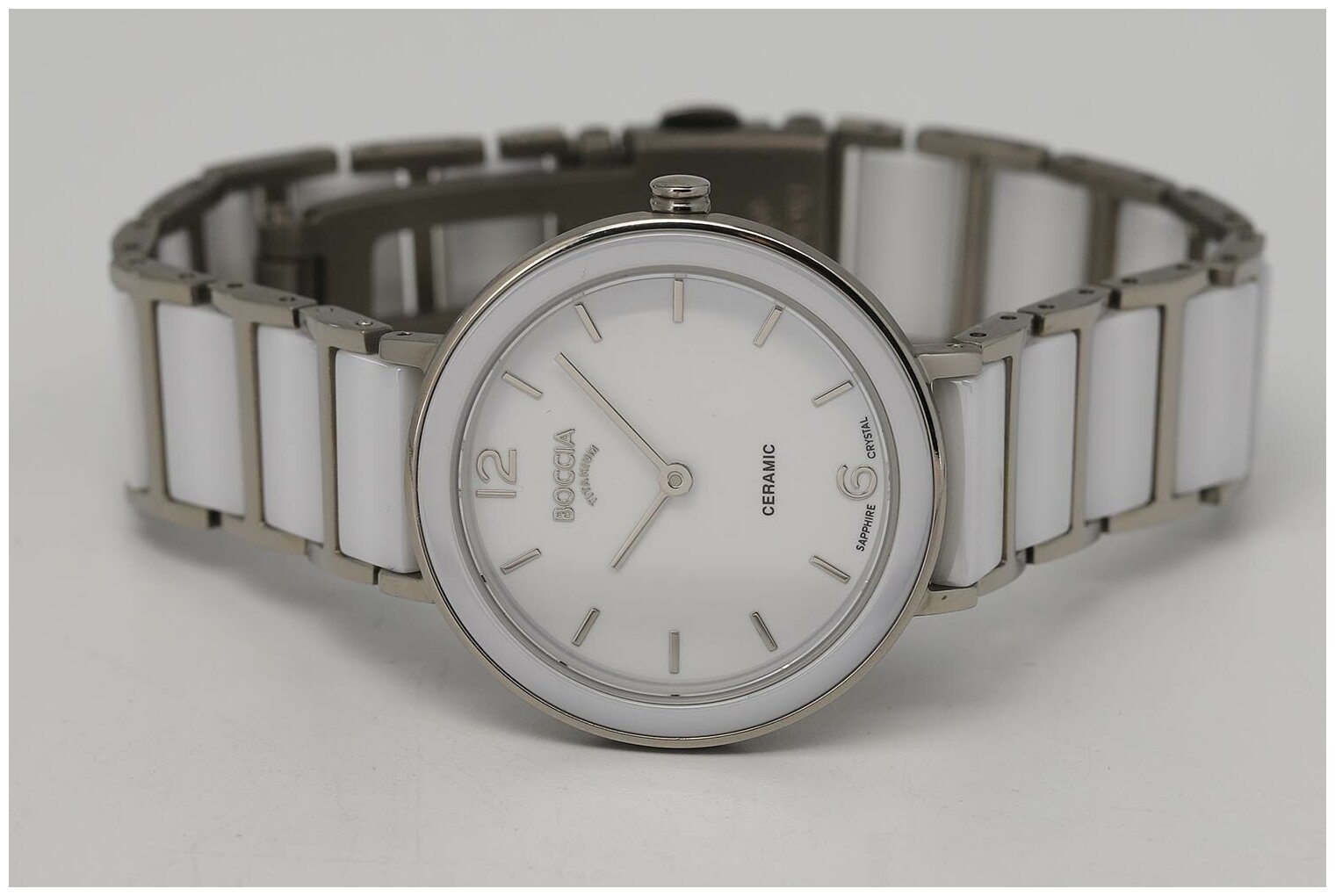 Лучшие цены. Женские кварцевые часы. Центральные часовая и минутная стрелки. Белый циферблат. Круглый корпус выполнен из гипоаллергенного титана с керамическим безелем. Диаметр корпуса составляет 31 мм, толщина 6,8 мм. Титановый браслет со вставками из белой керамики, раскладывающаяся застежка. Устойчивое к возникновению царапин сапфировое стекло. Водостойкость WR 50 (мытье рук, дождь). Магазины в вашем городе.