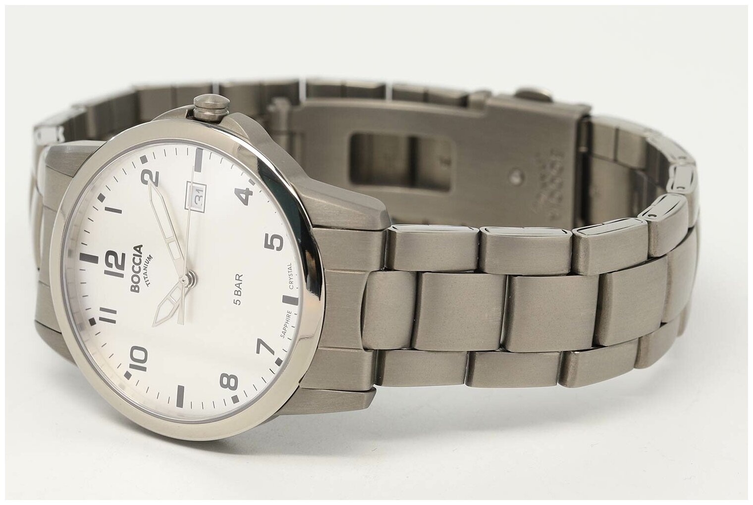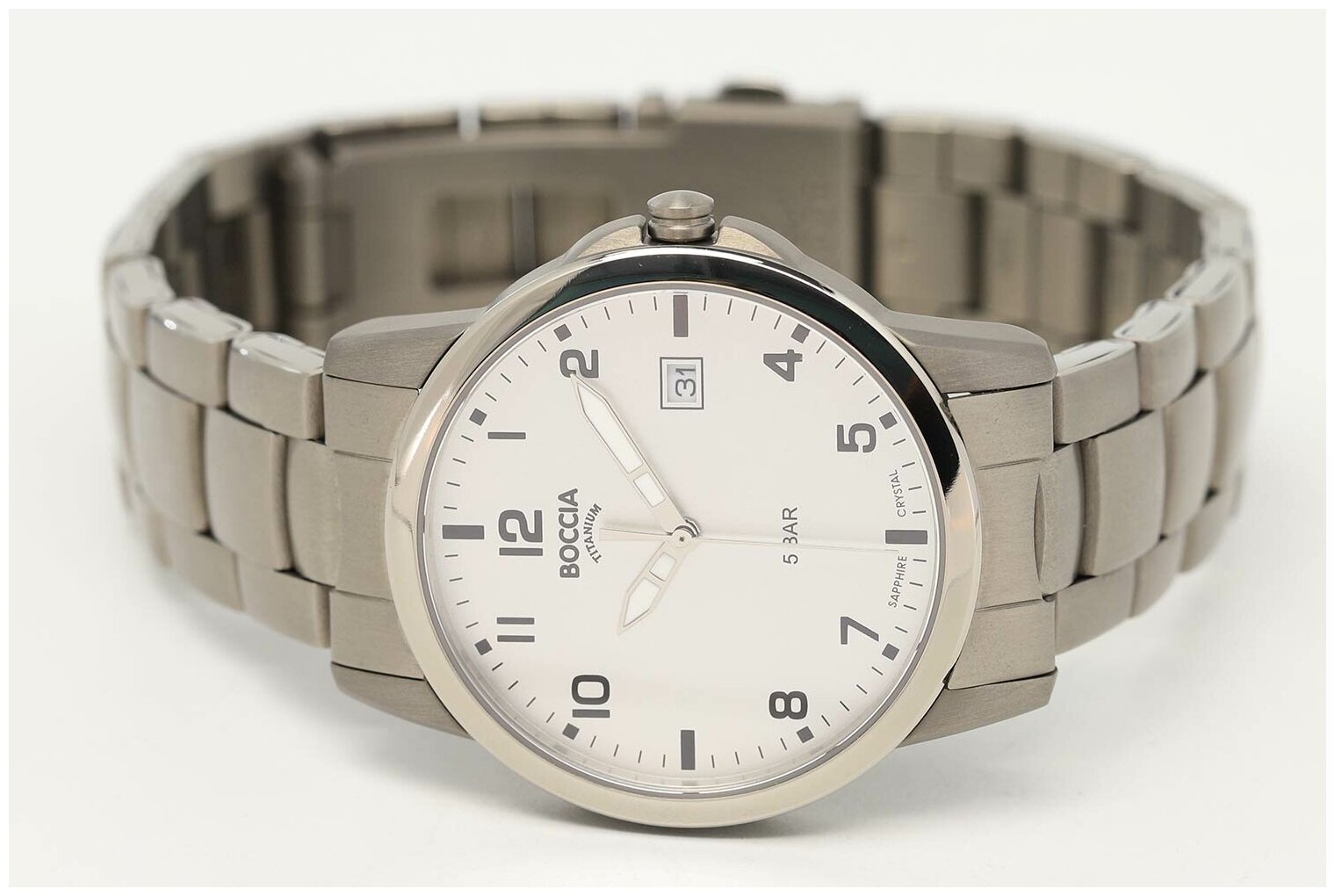 Лучшие цены. Мужские кварцевые часы. Центральные часовая, минутная и секундная стрелки. Апертура даты в позиции 3 часов. Белый циферблат. Арабская индикация времени. Круглый корпус выполнен из гипоаллергенного титана. Диаметр корпуса составляет 36 мм. Заводная головка с защитой. Титановый браслет, раскладывающаяся застежка. Устойчивое к возникновению царапин сапфировое стекло. Водостойкость WR 50 (мытье рук, дождь). Магазины в вашем городе.