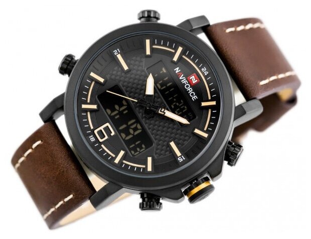 Лучшие цены. Наручные часы Naviforce NF9135 выполнены в современном урбанистическом стиле. В них соединили классический дизайн и спортивный характер. Необычное сочетание дополнительно подчеркнуто нарочито грубым ремешком из натуральной кожи. Отличные часы для тех, кто ищет экстрима даже в аксессуарах. Данная модель отличается наиболее широким функционалом, который включает: двойное отображение времени, секундомер, будильник, ежечасный сигнал, отображение даты и дня недели, подсветку. Магазины в вашем городе.