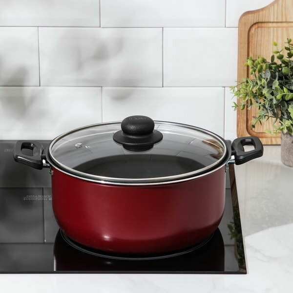 Кастрюля для приготовления на плите из алюминия SCOVO "Эксперт", стеклянная крышка, антипригарное покрытие, цвет бордовый, 4,5 л, d=24 см
