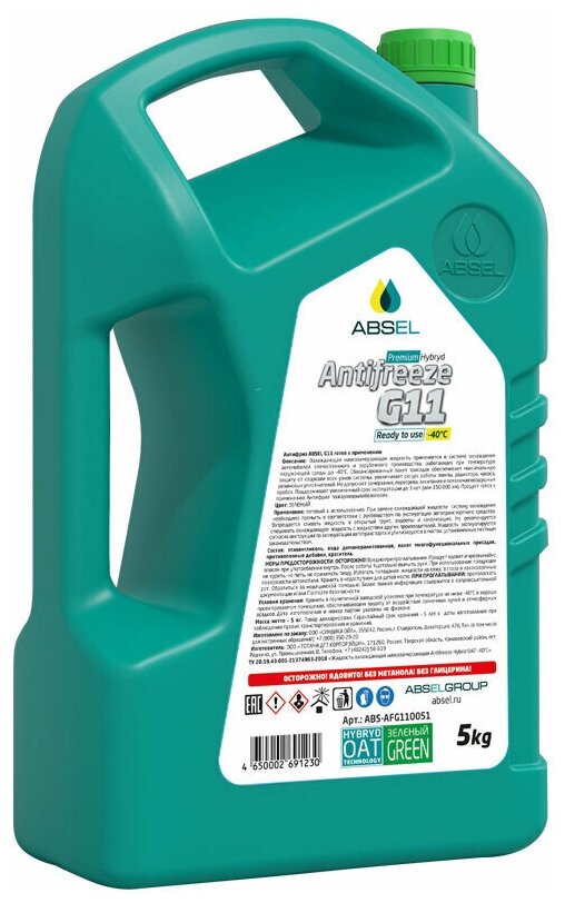 Лучшие цены. Охлаждающая жидкость ABSEL G11 PREMIUM GREEN -40C Жидкость охлаждающая низкозамерзающая ABSEL G11 PREMIUM GREEN -40C приготовлена на основе высококачественного моноэтиленгликоля и подобранных ингибиторов коррозии. Не содержит метанола и глицерина. Жидкость охлаждающая низкозамерзающая ABSEL G11 PREMIUM GREEN -40C поставляется в готовом виде и не подлежит разбавлению водой. Во избежание ухудшения эксплуатационных свойств не рекомендуется смешивать жидкость с жидкостями других производителей. Магазины в вашем городе.