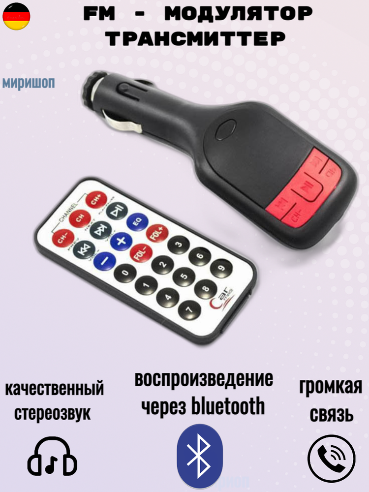 Лучшие цены. Fm модулятор FM02 Bluetooth, MP3 , Aux , поможет прослушивать Ваши аудио файлы через музыкальную систему автомобиля с любых устройств (смартфон, планшет или MP3 плеер). Так же есть возможность слушать любимую музыку или аудио книги карточек памяти формата microSD. Беспроводной FM трансмиттер обладает компактным ЖК экраном, на котором содержится информация о текущем треке или частота прослушиваемой радио волны. А разъем USB на 5V, 3.1А, позволит заряжать ваш девайс в дороге. Магазины в вашем городе.