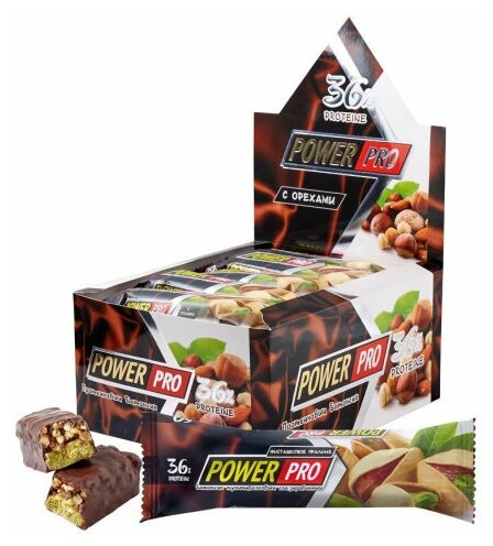 Протеин Power Pro Батончики Power Pro с цельными орехами и фруктами 60 г, 20 шт, вкус: фисташковое пралине