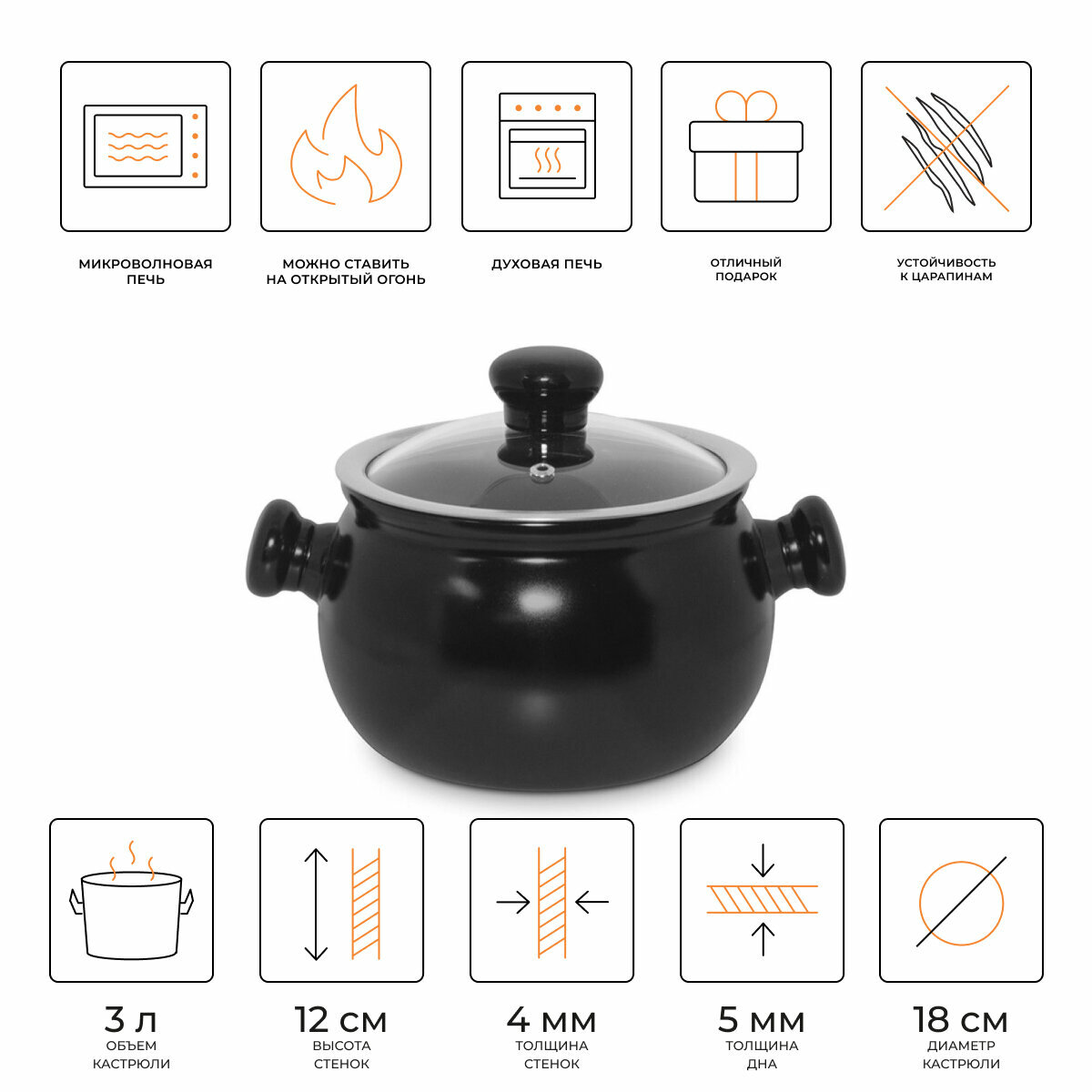 Кастрюля Кастрюля керамическая со стеклянной крышкой Ceraflame Premiere 18 см, 3 л, чёрный