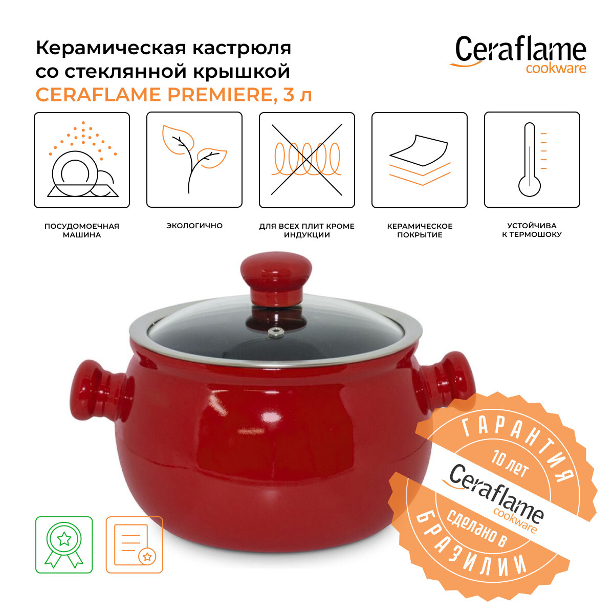 Кастрюля Кастрюля керамическая со стеклянной крышкой Ceraflame Premiere 18 см, 3 л, красная