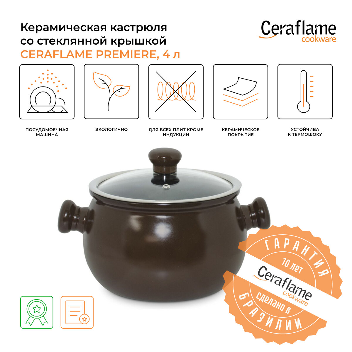 Лучшие цены. Кастрюля Ceraflame Premiere изготовлена из высококачественной жаропрочной керамики. Изделие покрыто гладкой эмалью, устойчивой к трещинам и царапинам. Непористая поверхность исключает образование бактерий, великолепно моется и будет оставаться новой и блестящей даже после использования абразивных губок и чистящих средств. Кастрюля идеально подходит для тушения и томления, приготовления рагу, плова, жаркое и других блюд. Магазины в вашем городе.