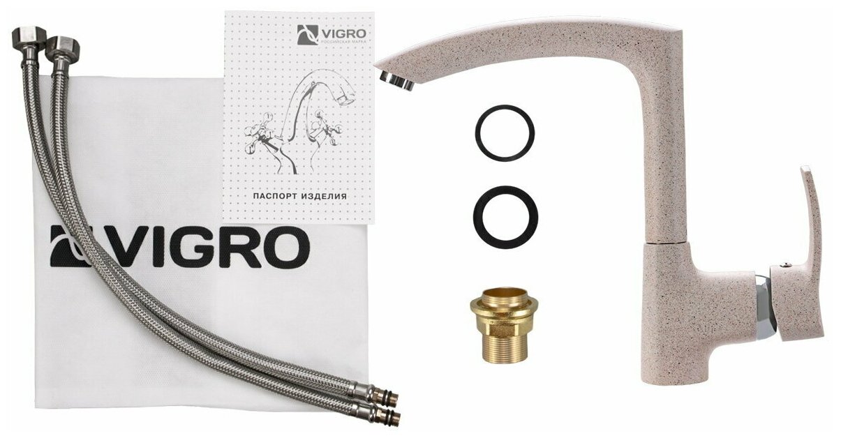 Лучшие цены. Смеситель для кухни VIGRO VG903 имеет современный дизайн, прост в установке и использовании. Мытье посуды и кухонной раковины будет происходить легко и просто. Смеситель для равковины выполнен из высококачественной латуни, что обеспечивает его стойкость к перепадам давления и температуры, тем самым подчеркивает свою долговечность. Подводка для воды и крепеж в комплекте. Кран для кухни данной коллекции подходит для разных интерьеров и типов моек. Магазины в вашем городе.