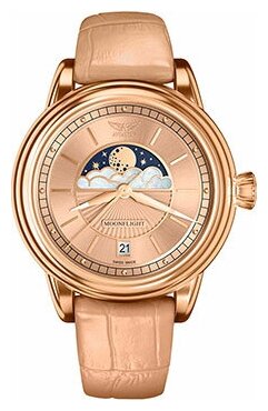 Лучшие цены. Женские кварцевые часы. Калибр механизма Ronda 708. Центральные часовая, минутная и секундная стрелки. Бежевый циферблат. Облака на циферблате украшены перламутровыми вставками. Апертура даты в позиции 6 часов. Фазы Луны. Люминесцентные стрелки. Круглый корпус выполнен из нержавеющей стали с PVD покрытием цвета розового золота. Диаметр корпуса составляет 36 мм, толщина 10 мм. Бежевый кожаный ремешок, стандартная застежка. Устойчивое к возникновению царапин сапфировое стекло с антибликовым покрытием. Магазины в вашем городе.