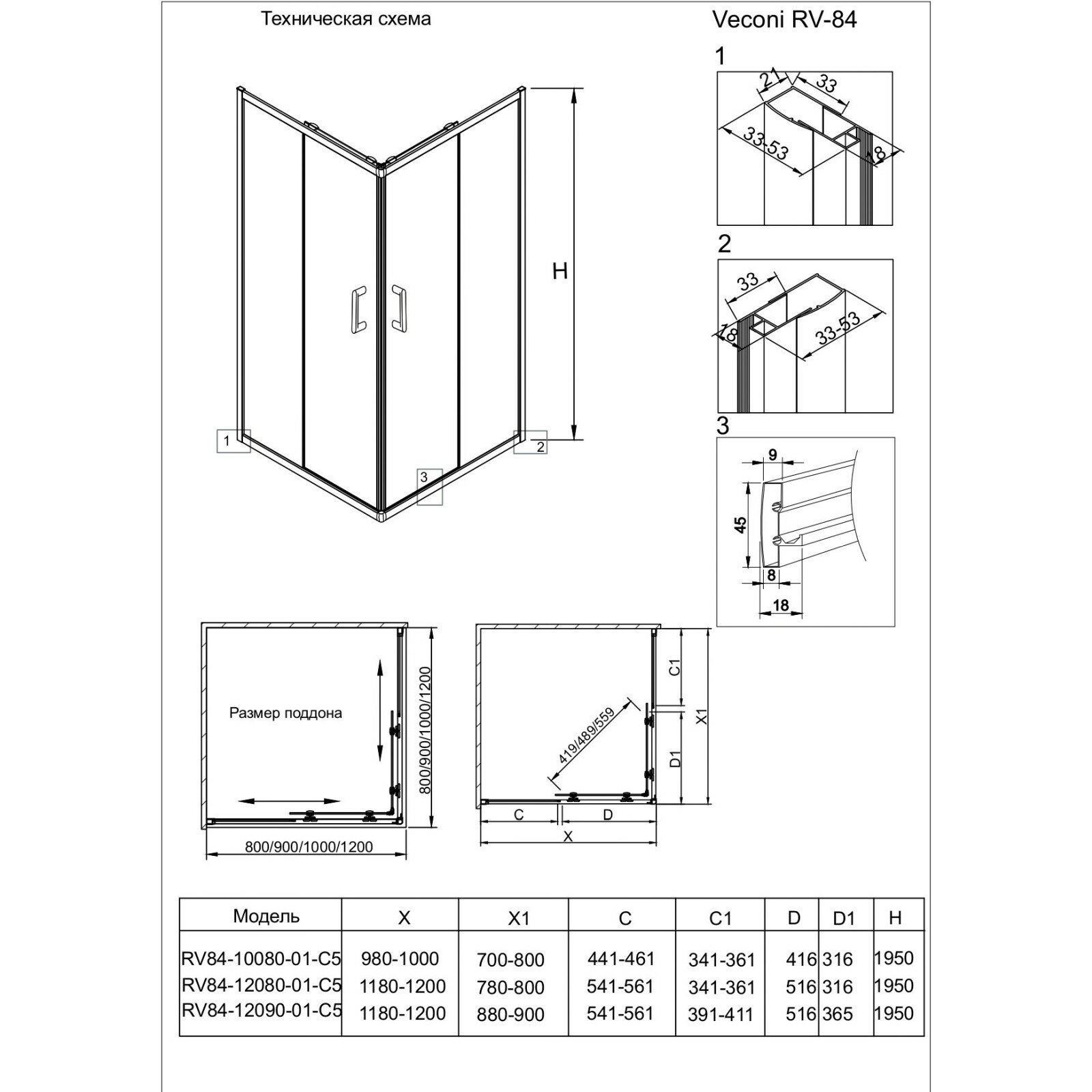 Душевая кабина Душевой уголок Veconi Rovigo 120х80х195 см стекло прозрачное, профиль Брашированый алюминий, механизм раздвижной (RV84-12080-01-C5)