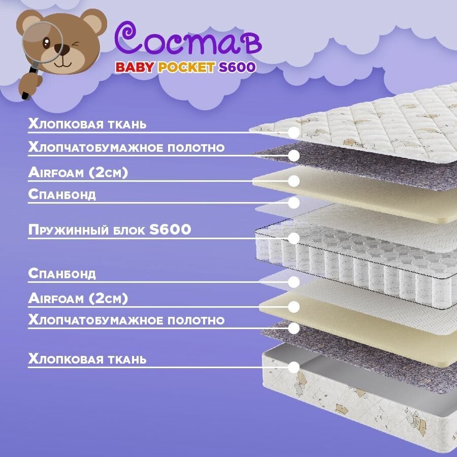 Лучшие цены. Детский матрас BeautySon Baby Pocket S600 80x160 – матрас с независимым пружинным блоком S600, обладающий анатомическими свойствами. Жесткость сторон: Средний / Средний В составе матраса используются современные гипоаллергенные материалы – AirFoam и хлопчатобумажное полотно • Особая конструкция независимого пружинного блока S600 обеспечивает точечную поддержку позвоночника и здоровое анатомическое положение тела во время сна. Магазины в вашем городе.