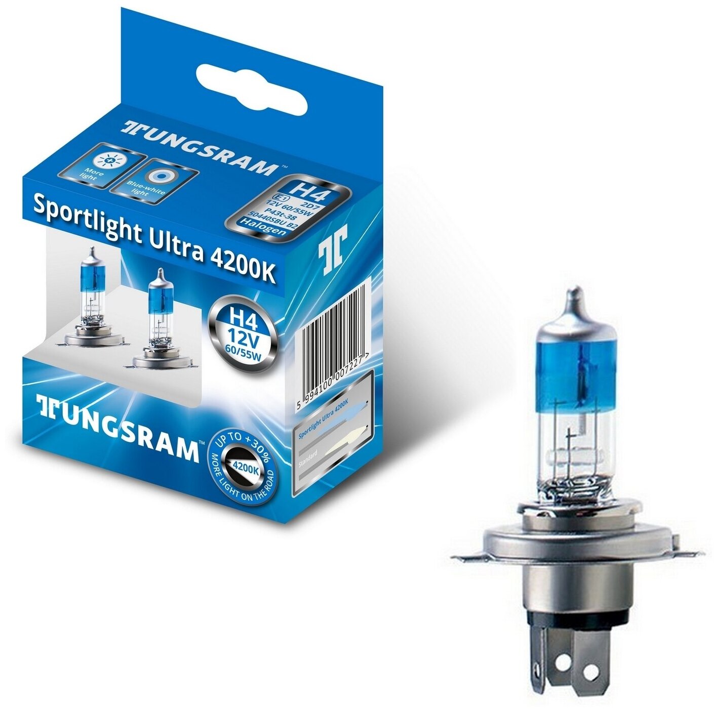 Автолампа Лампы TUNGSRAM "Sportlight Ultra", H4, +30%, 12V, 60/55W, P43t, 4200K, комплект 2 шт.
