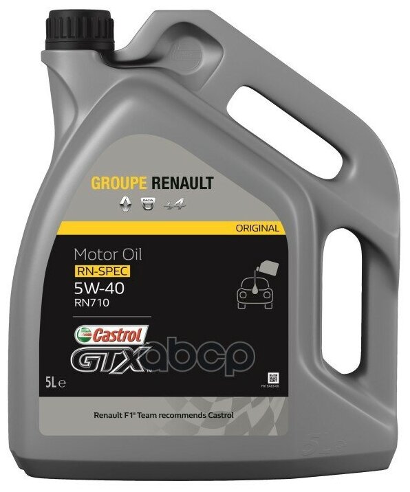 Лучшие цены. Renault - Castrol GTX RN-SPEC 5W-40 RN 710 – полностью синтетическое моторное масло для бензиновых и дизельных двигателей, в которых производитель техники рекомендует использовать смазочные материалы, соответствующие требованиям спецификации RN0710. Применение Renault - Castrol GTX RN-SPEC 5W-40 RN 710 - полностью синтетическое моторное масло специально разработанное для применения с увеличенными интервалами замены во всех бензиновых и дизельных автомобилях, не оснащённых устройствами для снижения. Магазины в вашем городе.