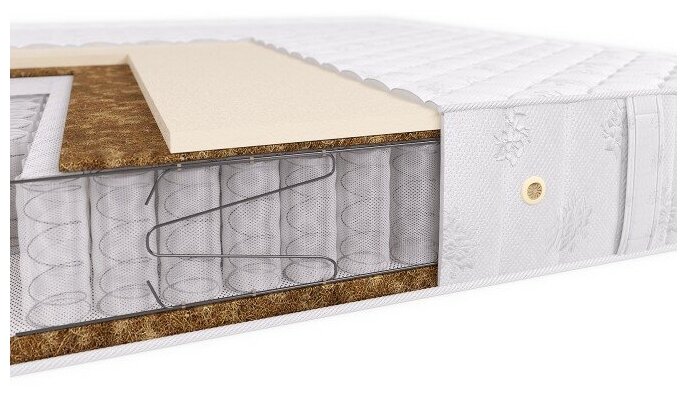Лучшие цены. Высота 21 см. Уровень жесткости средний/жесткий. Искусственный латекс 2 см, полиэфирное кокосовое волокно Bi-Cocos 1 см, спанбонд, независимый пружинный блок "ТФК" (TFK) 300 пр./кв. м 14 см, спанбонд, полиэфирное кокосовое волокно Bi-Cocos 3 см. Чехол из трикотажной ткани, простеган на синтепоне и спанбонде. Максимальный вес на 1 спальное место 130 кг. Магазины в вашем городе.