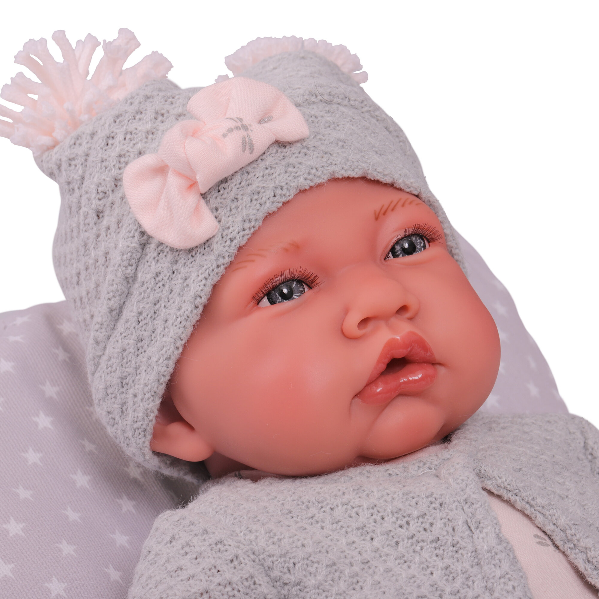 Пупс "Recién Nacida con cojín y chaqueta" (Малышка в серой куртке с подушкой)