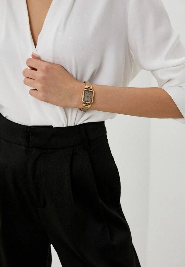 Лучшие цены. Женские кварцевые часы. Центральные часовая, минутная и секундная стрелки. Серый перламутровый циферблат. Прямоугольный корпус выполнен из металла с IP покрытием цвета желтого золота и декорирован кристаллами по безелю. Ширина корпуса составляет 22 мм. Стальной браслет с покрытием и серой эмалью, браслетная застежка. Прочное минеральное стекло устойчивое к мелким механическим повреждениям. Водостойкость WR 30 (брызги). В комплекте аксессуар браслет. Магазины в вашем городе.
