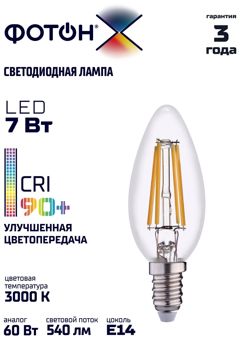 Лучшие цены. ХарактеристикиТип: филаментнаяЦоколь: E14Цветопередача, Ra: 90Диаметр, мм: 37Требует пуско-регулирующей аппаратуры: нетДлина, мм: 47Вид: CL/прозрачнаяТип колбы: CЦветовая температура, К: 3000Световой поток, Лм: 600Срок службы, ч: 30000Мощность (Вт): 7Напряжение, В: 220Угол светового пучка, град: 210Эквивалент лампы накаливания, Вт: 60Цветность: теплый белый (менее 3300 К). Магазины в вашем городе.