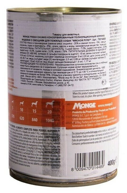 Лучшие цены. Monge (Монж) Dog Fresh Senior Chunks in Loaf TACCINO con ORTAGGI полнорационный влажный корм с мясом индейки и овощами для пожилых собак всех пород. Аппетитные мясные кусочки в паштете для пожилых собак из отборных ингредиентов высокого качества с мясом индейки и овощами. Особенная технология приготовления, путем смешивания мясных кусочков и паштета, придаёт корму необычную текстуру, что сможет удивить и заинтересовать вашего питомца. Без ГМО, искусственных красителей и ароматизаторов. Сделано в Италии. Магазины в вашем городе.