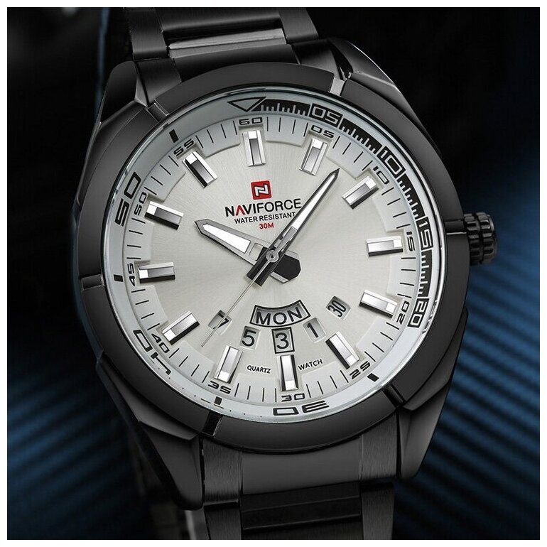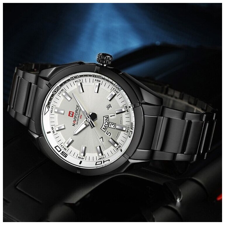Лучшие цены. Naviforce NF9038 – практичные часы в классическом дизайне на каждый день. Они выполнены в круглом корпусе на ремешке из нержавеющей стали. Циферблат защищен ударопрочным минеральным стеклом. Корпус данной модели не пропускает к кварцевому механизму влагу. Дополнительно в них встроен календарь, с помощью которого вы легко сможете установить текущую дату. Особенности часов Naviforce NF9038 (B/W) Прочный корпус Безупречный кварцевый механизм спрятан внутри крепкого металлического корпуса. Магазины в вашем городе.
