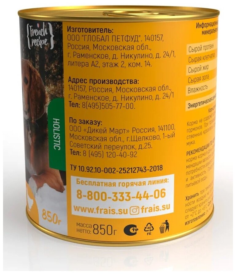 Корм для собак FRAIS HOLISTIC 850гр Корм для собак мясные кусочки с курицей в желе