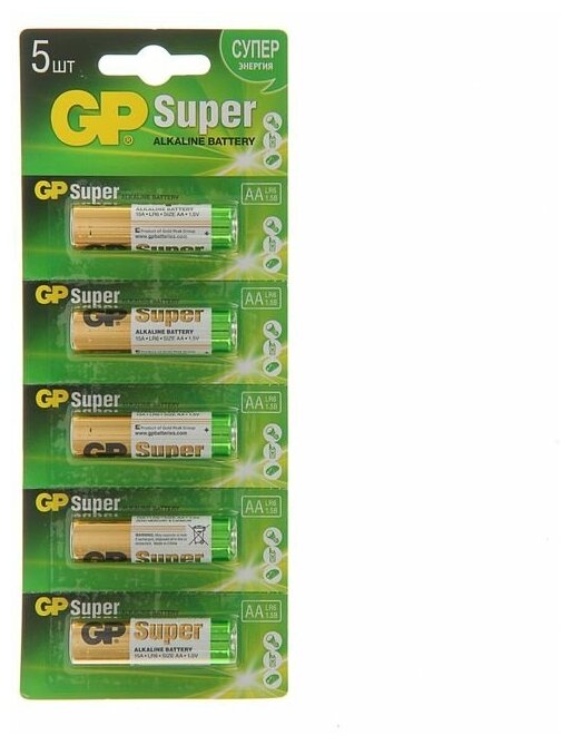 Аккумуляторы и батарейки Батарейка алкалиновая GP Super, AA, LR6-5BL, 1.5В, отрывной блистер, 5 шт.
