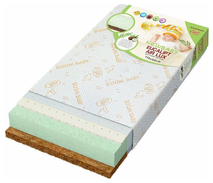 Лучшие цены. Boom Baby Матрас NewBaby Eucalipt Air Lux 119х60х13 Матрас подходит для стандартной детской кроватки размером 120х60 см. Жесткость сторон 3/4. Матрас укомплектован съемным чехлом с вшитой для безопасности малыша потайной молнией. Чехол выполнен из брендированного многослойного трикотажа Boom Baby, обладающего собственной технологической стежкой, что придаёт ему объёма и мягкости. Магазины в вашем городе.