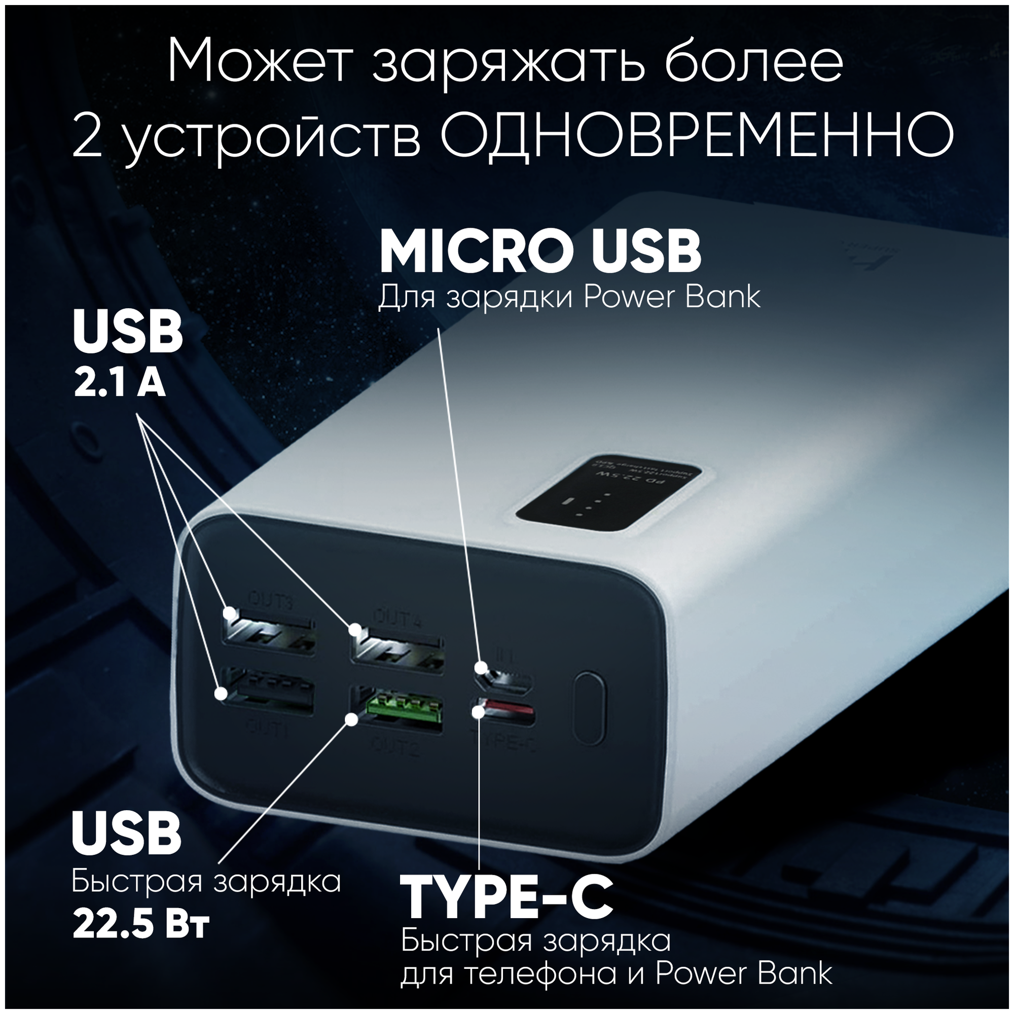 Лучшие цены. Твой максимум энергии – с портативным аккумулятором WB-730! Powerbank оснащен аккумулятором на 30 000 mAh, которого хватит для полной зарядки смартфона пять или шесть раз, имеет 4 разъема USB-А, что позволит заряжать несколько устройства одновременно, а также порт Type-C с поддержкой технологии быстрой зарядки PowerDelivery с мощностью до 22.5 Вт. Сам портативный аккумулятор заряжается через кабель MicroUSB, который уже есть в комплекте. А LED-индикатор позволяет следить за остаточным уровнем заряда. Магазины в вашем городе.