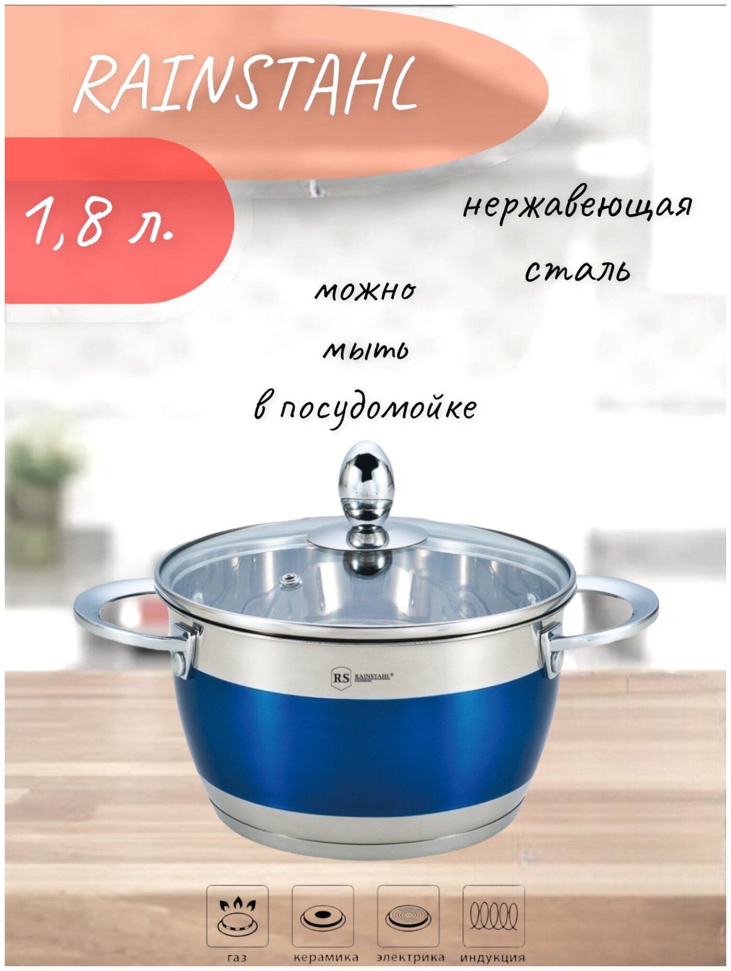 Лучшие цены. Кастрюля ТМ RAINSTAHL объем- 1,8л, сделана из высококачественной нержавеющей хромо-никелевой стали с толщиной стенок 0,8 мм, что гарантирует долгий срок службы и превосходные эксплуатационные качества. Имеет многослойное термоаккумулирующее капсульное дно с алюминиевыми вставками, что обеспечивает равномерный нагрев и равномерное распределение тепла при готовке, и подходит для всех типов плит, включая индукционные. Магазины в вашем городе.