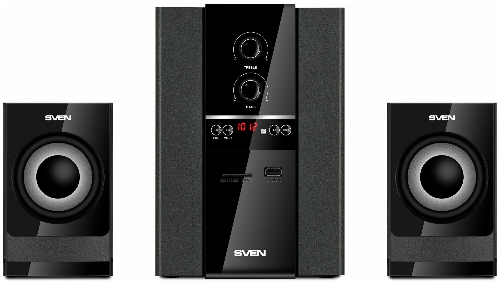 SVEN MS-1821 чёрный, 2.1, мощность(RMS):20Вт+2х12 Вт, Bluetooth, FM-тюнер, USB/SD, дисплей, пульт ДУ)