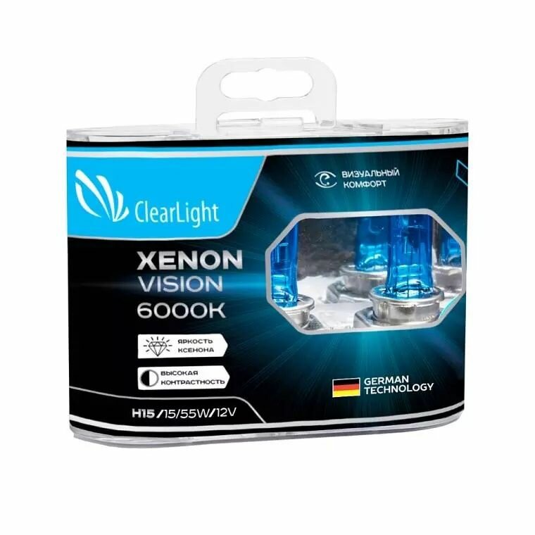 Лучшие цены. Лампочки автомобильные галогеновая Clearlight H15 серии Xenon Vision освещает дорогу холодным голубовато-белым холодным светом и производит эффект ксеноновых ламп. Лампы автомобильные этой серии подойдут для тех, кто хочет комфортный ксеноновый цвет на своем авто, но не хочет переделывать под него фары. Автомобильные лампы имеют световую температуру 6000К. Автолампа излучает холодный свет максимально приближенный к естественному дневному свету. Магазины в вашем городе.