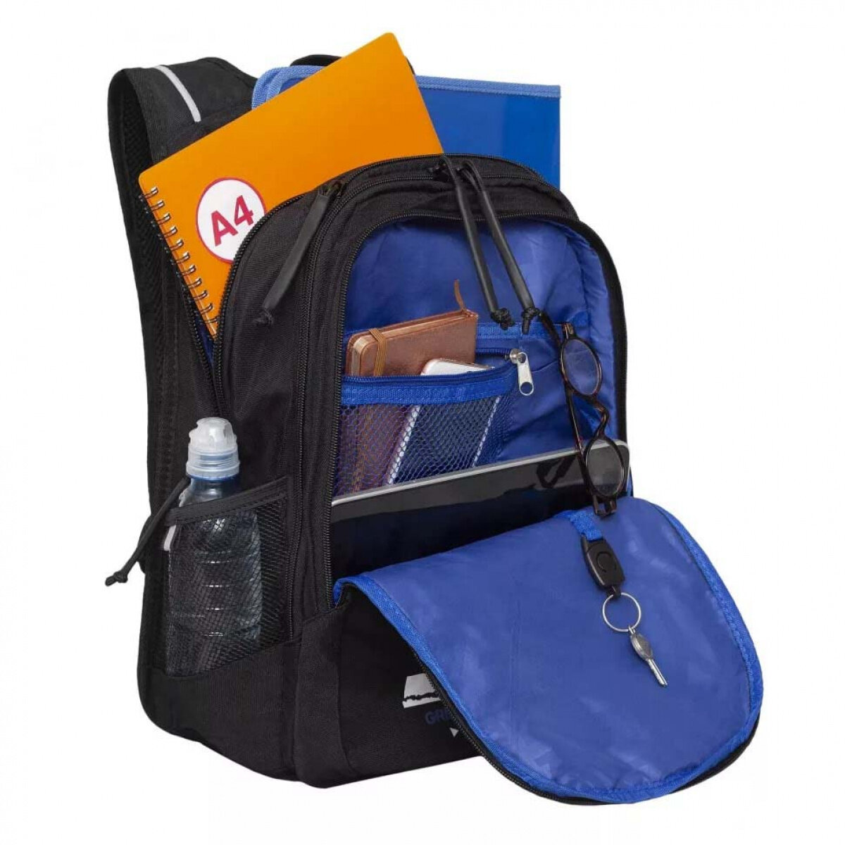 Школьный рюкзак (ранец) Школьный рюкзак с ортопедической спинкой GRIZZLY RU-338-3 черный - синий, грудная стяжка, 3 отделения, 42x31x22см, 17л.
