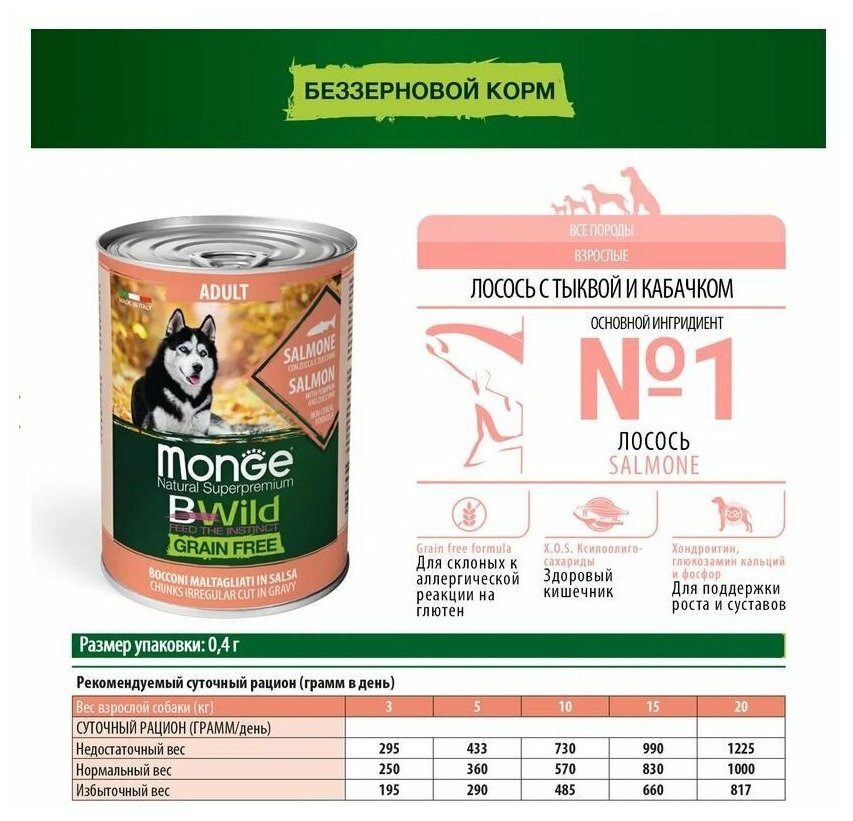 Лучшие цены. Monge (Монж) Dog BWild GRAIN FREE(холистик) полнорационные беззерновые консервы из мяса лосося с тыквой и кабачками для собак всех пород. Сбалансированный полнорационный беззерновой корм (холистик) из мяса лосося с тыквой и кабачками, который разработан с учётом физиологических особенностей взрослых собак. Идеально подходит в качестве повседневного рациона для домашних питомцев. Содержит альтернативные источники беззлаковых углеводов, таких как, тыква и цуккини. Магазины в вашем городе.