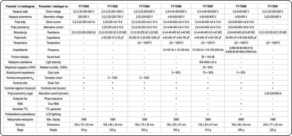 Лучшие цены. Мультиметры и тестеры Yato Универсальный цифровой измеритель, YT-73080 -Цифровой измеритель позволяет измерять напряжение тока постоянного и переменного. -Кроме того, универсальный измеритель электрический позволяет измерять сопротивления, емкости конденсаторов, частоты, тока и температуры, а также позволяет проверить светодиоды. -Мультиметр имеет пластиковый корпус в котором установлены измерительные гнезда, и гнездо для проверки транзисторов. Магазины в вашем городе.