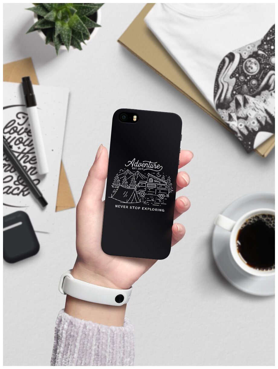 Лучшие цены. Чёрный чехол для iPhone 5/5S/SE с оригинальным принтом " Never stop exploring" понравится всем, чей девиз " Никогда не прекращать исследовать". Дизайн в стиле ретро универсален и подойдет для всех возрастов. С покрытием Soft-touch. Чехол придаст вашему устройству новый изящный вид, а также накладка из качественного материала надежно защищает корпус смартфона от механических повреждений, царапин и загрязнений. Имеет все необходимые отверстия для кнопок и портов. Магазины в вашем городе.