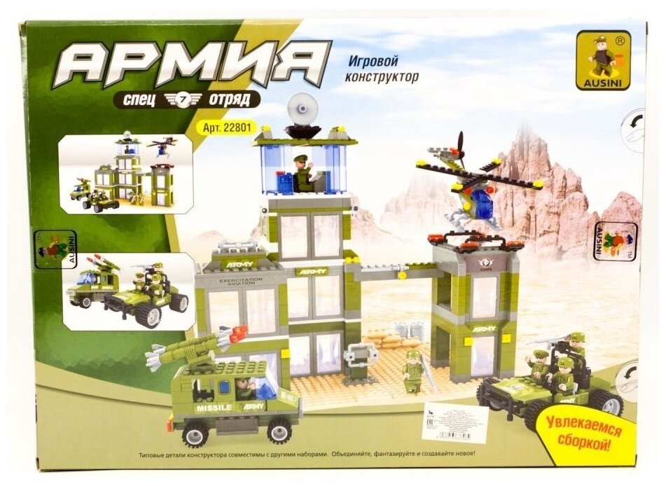 Лучшие цены. На страже РодиныКомандный пункт имеет большое значение в любой спецоперации. С набором торговой марки Ausini мальчишка соберёт штаб и будет разрабатывать оборонные стратегии и контролировать выполнение поставленных задач. ОсобенностиНабор содержит 550 деталей и позволяет сконструировать оборудованный штаб, вертолёт, вездеход, ракетную установку и фигурки военнослужащих. Элементы изготовлены из высококачественной пластмассы, надёжно соединяются между собой и разбираются без особого труда. Магазины в вашем городе.