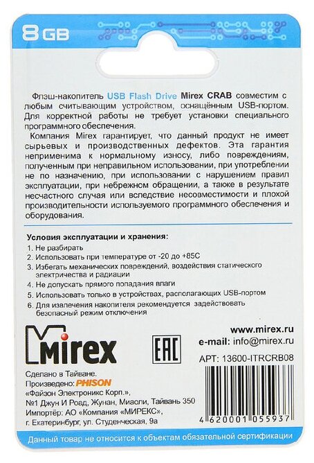 USB-флешки Флеш накопитель 8GB Mirex Crab, USB 2.0 13600-ITRCRB08