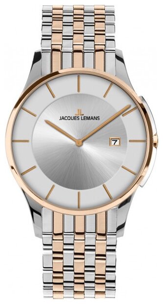 Лучшие цены. Элегантность без лишних деталей — таким девизом руководствовались дизайнеры Jacques Lemans при создании этих мужских кварцевых часов. В тонком стальном корпусе заключен хорошо читаемый циферблат. Центральная часть его выделяется за счет полировки и служит прекрасным фоном часовой и минутной стрелкам и апертуре даты. Образ дополняют риски. Часы представлены на браслете из гипоаллергенной стали 316L. Стальные элементы часов декорированы PVD-покрытием из розового золота. Магазины в вашем городе.