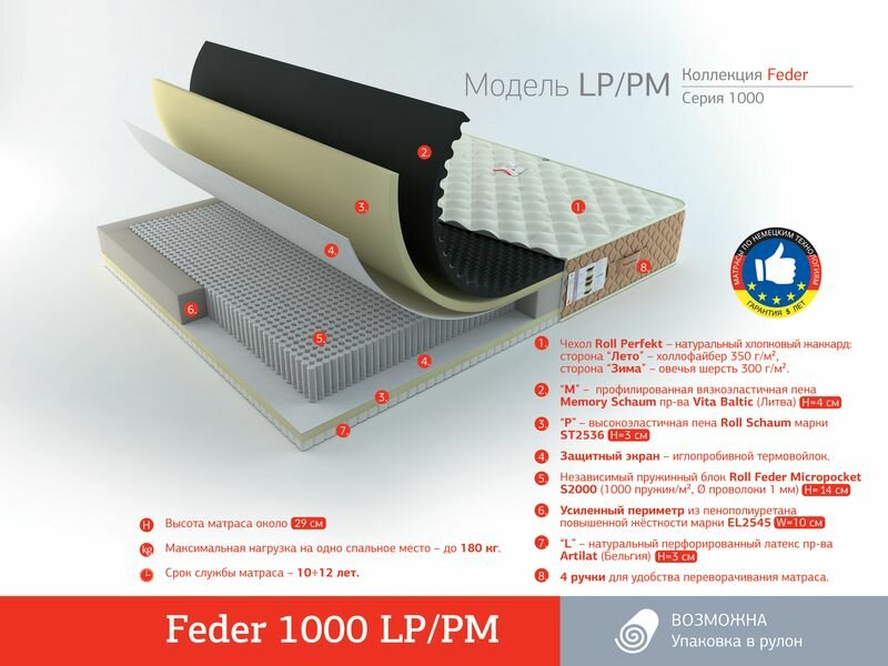 Лучшие цены. Матрас Feder (Федер) 1000 LP/PM - пружинный матрас повышенной комфортности с универсальной комбинацией слоев с эффектом памяти формы категории LUX, сделает Ваш сон поистине королевским! Отличный вариант для тех, кто ищет умеренно-мягкую деликатную поддержку высокого качества и любит расслабиться, снять напряжение во время сна! Натуральный латекс - упруго-мягкий материал, равномерно обеспечивающий абсолютный эффект расслабления и релаксации опорно-двигательного аппарата. Магазины в вашем городе.