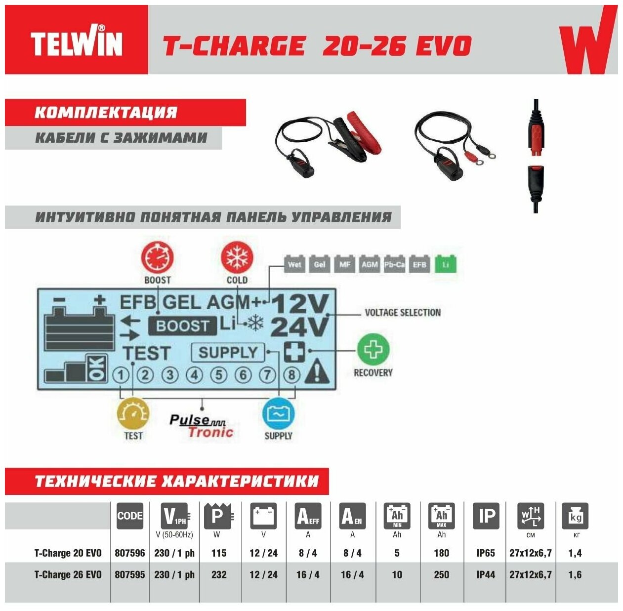 Лучшие цены. T-CHARGE 20 EVO – автоматическое электронное зарядное устройство на 12V/24V с импульсной технологией Pulse Tronic для зарядки аккумуляторов напряжением 12/24 В. Многофункциональное электронное зарядное устройство с функцией поддержания заряда и тестером для аккумуляторов типа WET, GEL, AGM, MF, PbCa, EFB, Li напряжением 12/24 В. ЗУ оснащено функцией поддержания заряда, а так же тестером для аккумуляторов, пусковой способности и генератора. Имеет ЖК-экран, на котором оперативно отображаются все параметры. Магазины в вашем городе.