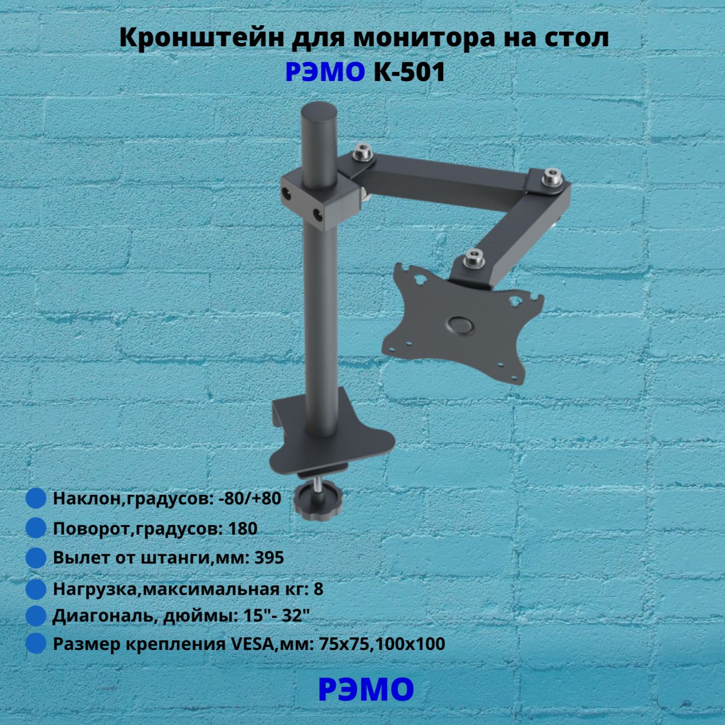 Подставки и крепления Кронштейн для монитора на стол наклонно-поворотный с диагональю 15"-32" Рэмо К-501,чёрный
