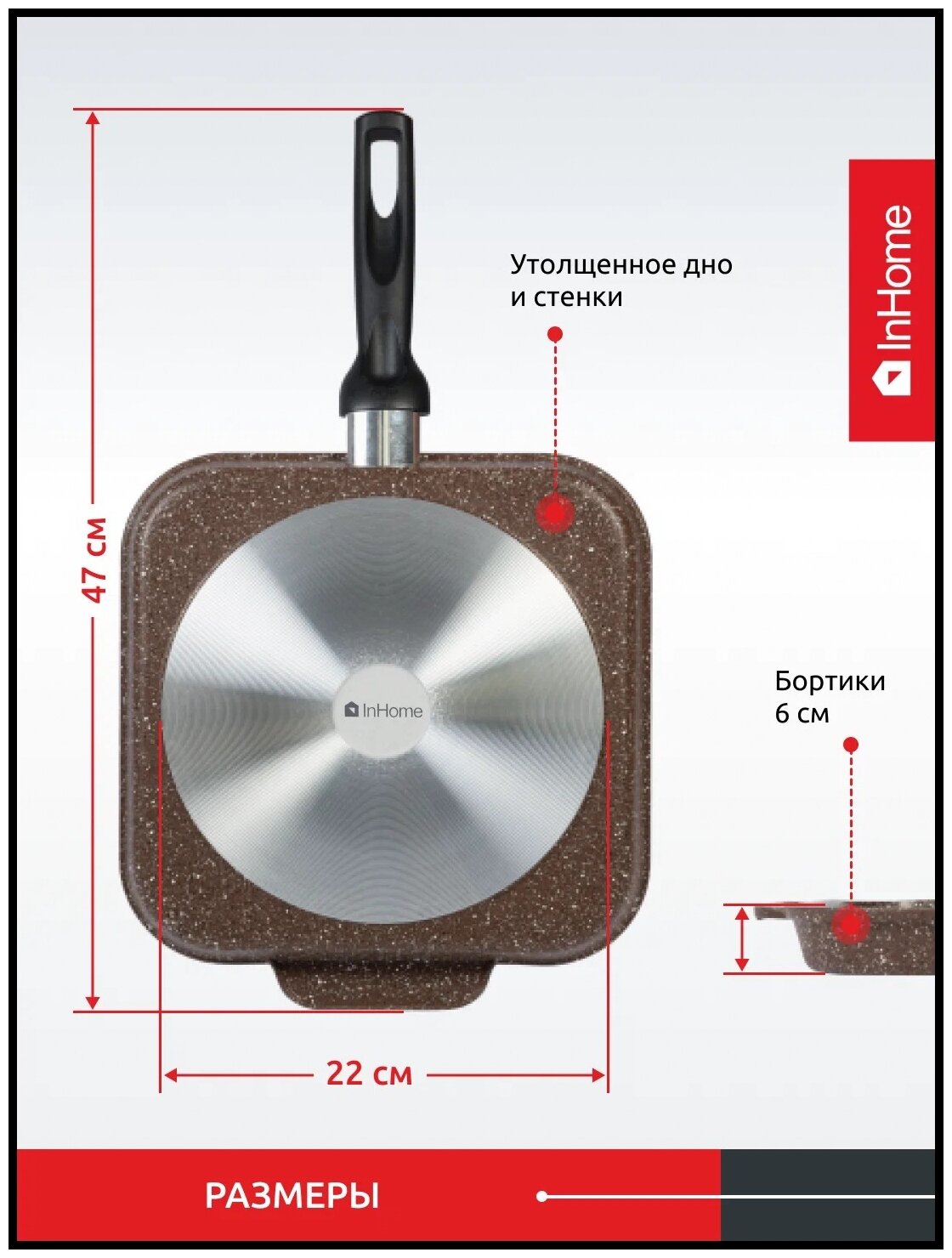 Литая квадратная сковорода-гриль с антипригарным покрытием, InHome IN0526/MR0