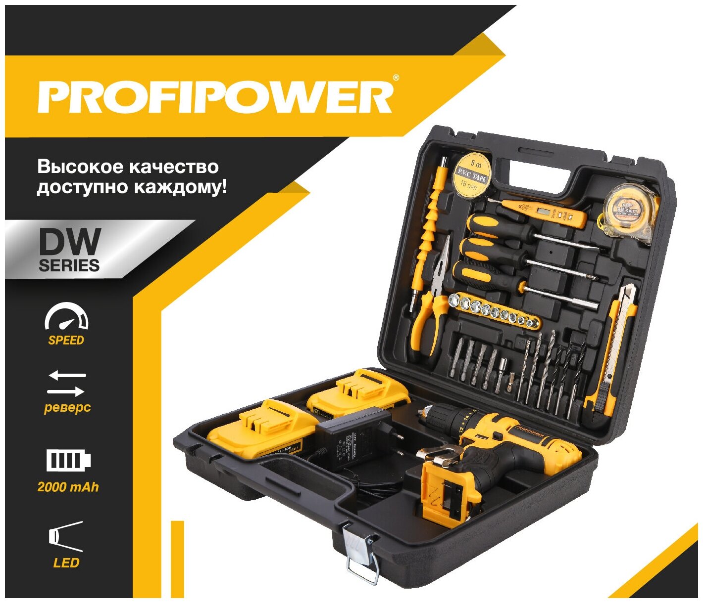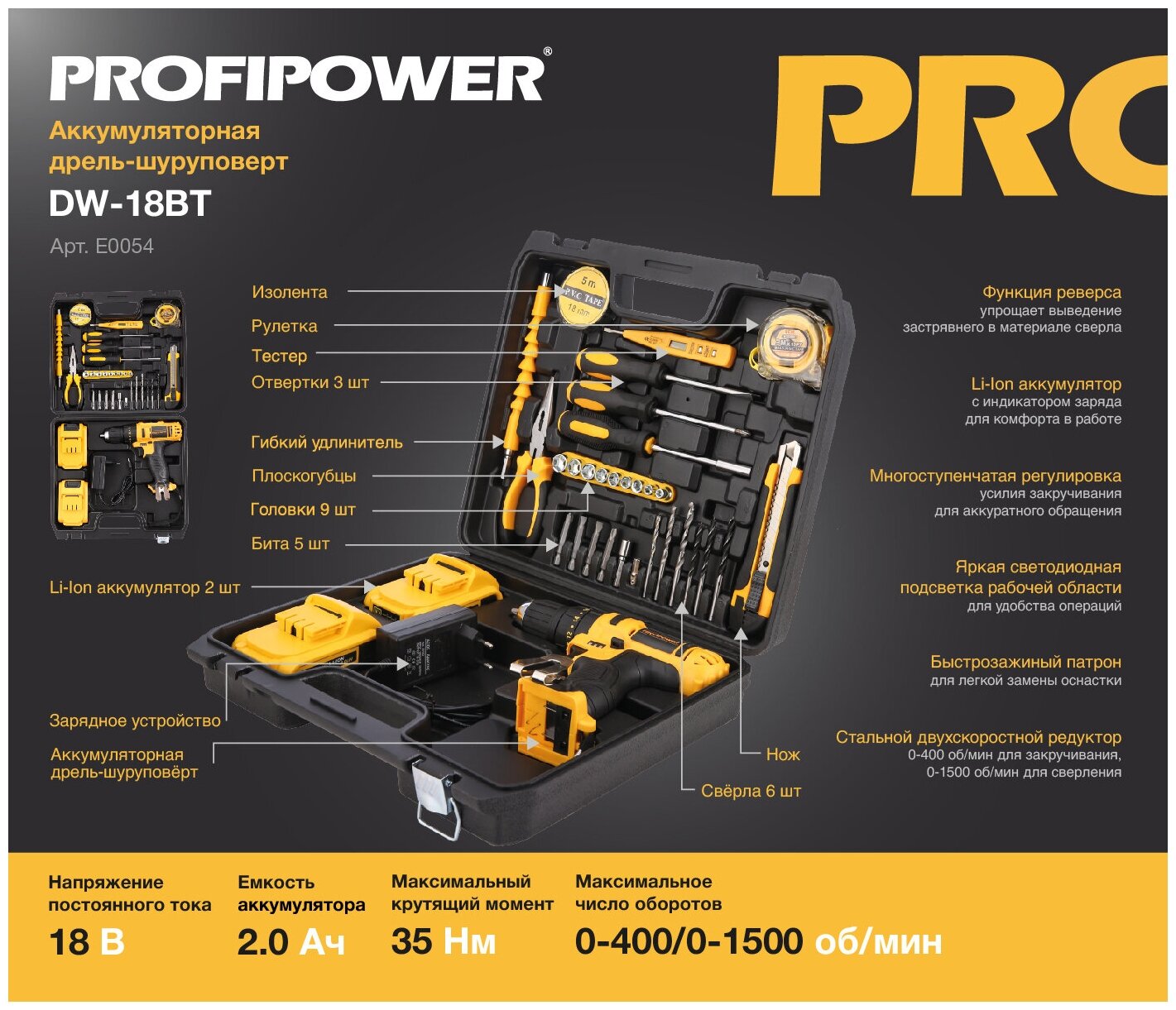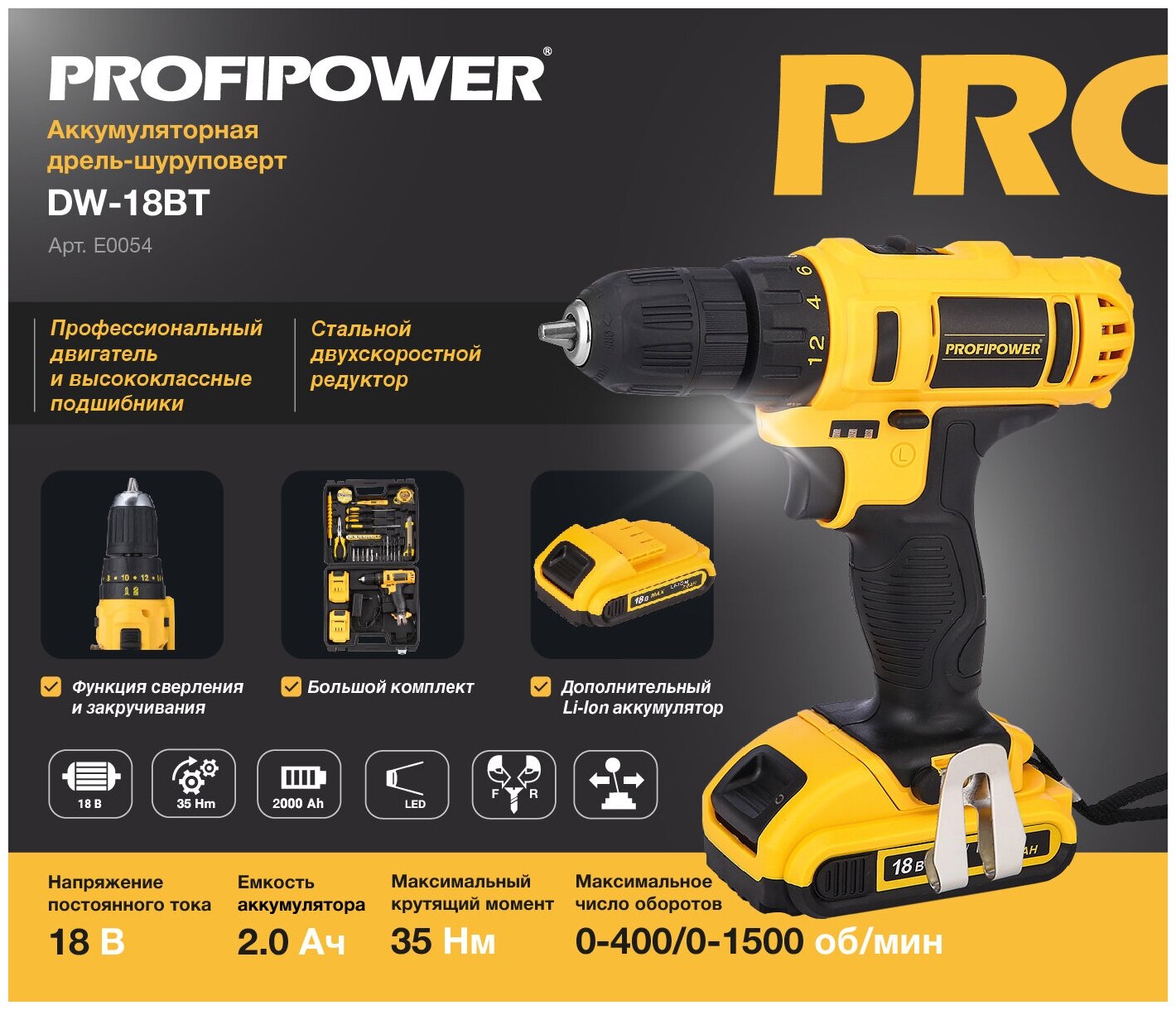 Дрели и шуруповерты Дрель шуруповерт ударная аккумуляторная бесщеточная Profipower 18В, DW-18BT