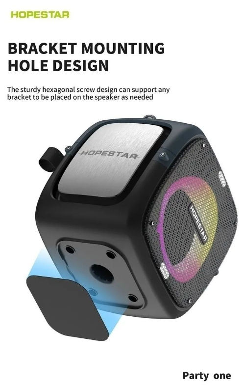Лучшие цены. Колонка Hopestar Party One с функцией Power bank Портативная колонка, выходная мощность: 80 Вт, два микрофона, подсветка динамичная. Техническая характеристика Hopestar Party One: Выходная мощность: 80 Вт Динамик ВЧ: 5,2 см x 2 шт (2 x 10 Вт) Динамик НЧ: 13,5 см x 1 шт (60 Вт) Частотный диапазон: 15Hz - 18KHz Беспроводной протокол: Bluetooth V5.0, TWS TWS дает возможность подключения двух колонок производителя Hopestar в одну аудиосистему Беспроводная связь: до 10 м Подсветка динамика: динамичная Микрофоны. Магазины в вашем городе.