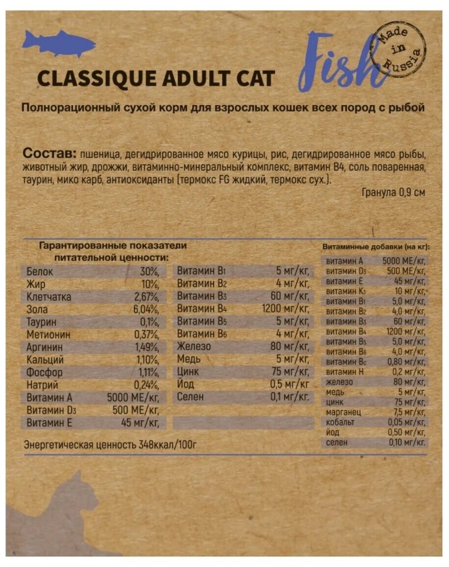 Лучшие цены. Полнорационный сухой корм для взрослых кошек всех пород с рыбой Frais Classique Adult Cat Fish, 2 килограмма. Гарантируемые показатели питательной ценности: белок 30%, жир 10%, клетчатка 2,67%, зола 6,04%, таурин 0,10%, метионин 0,37%, аргинин 1,49%, кальций 1,10%, фосфор 1,11%, натрий 0,24%, витамин А 5000 МЕ/кг, витамин D3 500 МЕ/кг, витамин Е 45 мг/кг, витамин В1 5 мг/кг, витамин В2 4 мг/кг, витамин В3 60 мг/кг, витамин В4 1200 мг/кг, витамин В5 5 мг/кг, витамин В6 4 мг/кг, железо 80 мг/кг, медь 5 мг/кг. Магазины в вашем городе.