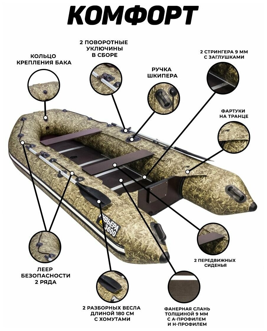 | Дополнительно | клапан спуска воды / ручки для переноски / поворотные уключины / водоотбойник / леерный трос |
